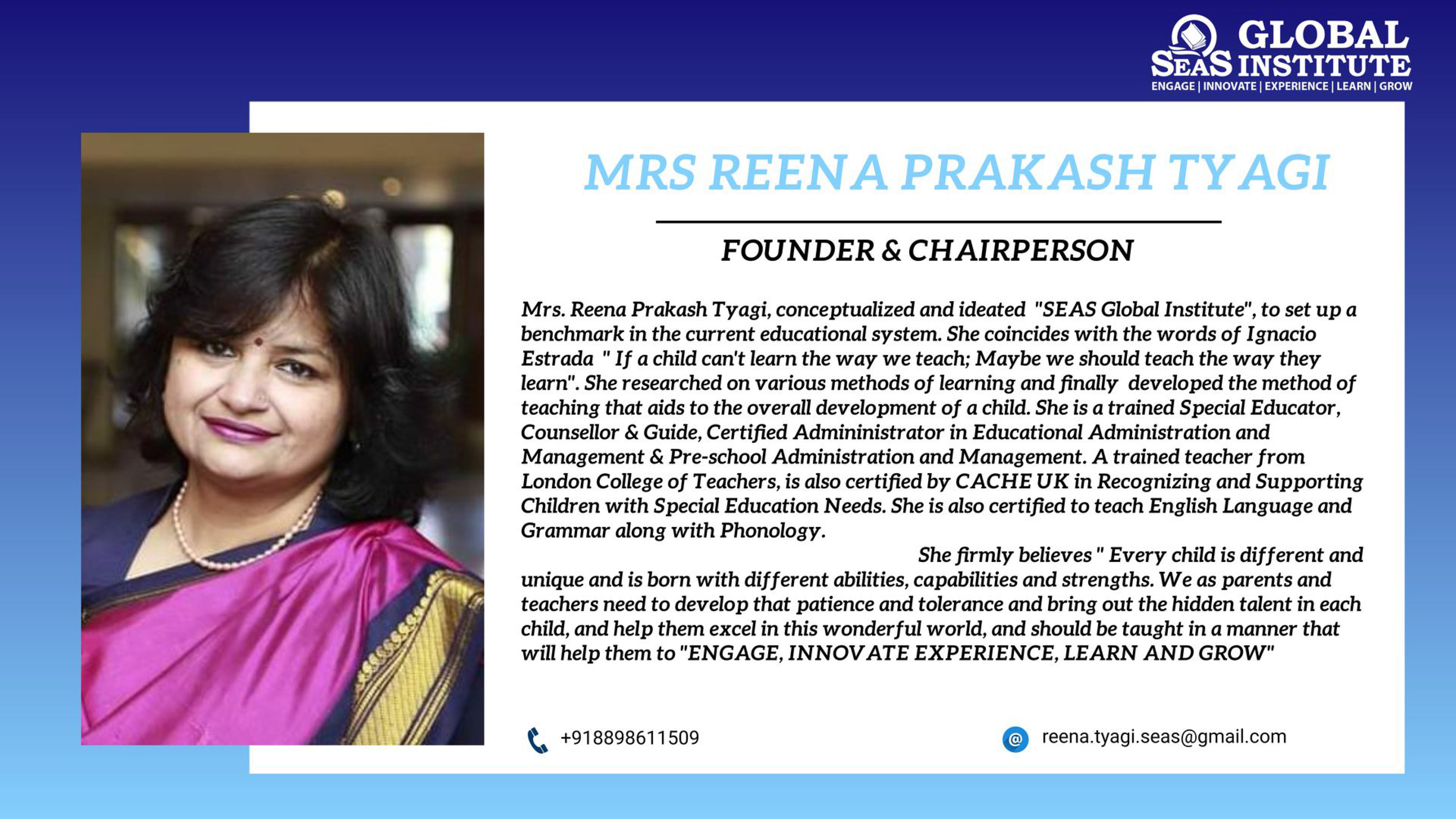 The SEAS GLOBAL INSTITUTE, is the brain child of Mrs Reena Prakash Tyagi, the Founder & Chairperson. It was conceptualized after a lot of brainstorming and discussions with our core team, The "SEAS GLOBAL INSTITUTE", the 1st Virtual School, of our country, that is 100% Virtual and has its corporate office in the beautiful Doon Valley, in the State of Uttarakhand., was inaugurated on 17/10/2020, by our then CM Shri Trivendra Singh Rawat Ji. We have students from across the country and teachers from within the country and abroad as well. We are an institution that has implemented NEP 2020, from Day 1.